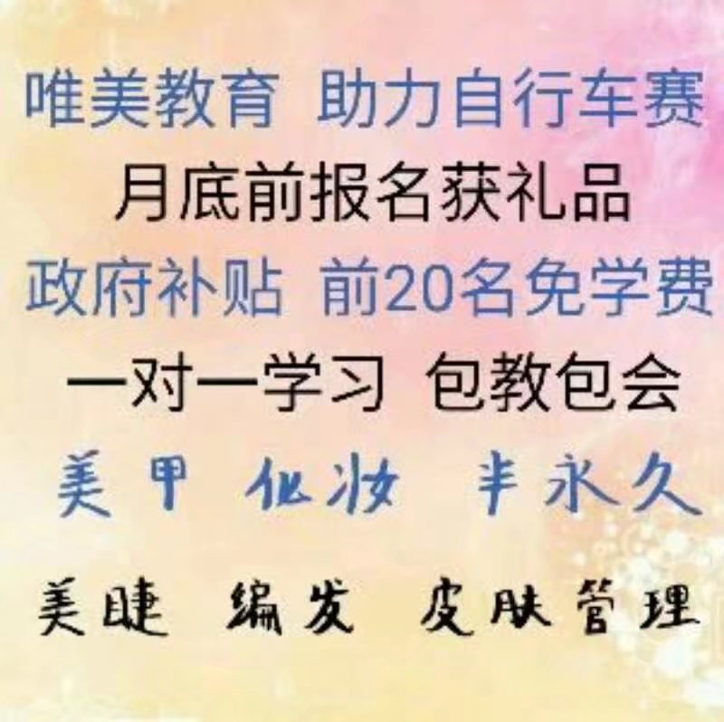 驚喜 驚喜 特大驚喜 唯美教育學(xué)校為迎接 邢臺(tái)自行車賽 特為愛美人士重推出以下助學(xué)活動(dòng): 凡在活動(dòng)期間外地需住宿學(xué)習(xí)的學(xué)員報(bào)名,即可獲得免住宿費(fèi)1 個(gè)月 凡在活動(dòng)期間報(bào)名學(xué)習(xí)的寶媽,均可為自己親愛的寶寶獲得超級(jí)可愛書包1 個(gè) 凡在活動(dòng)期間報(bào)名學(xué)習(xí)的單身女孩或已婚但未當(dāng)寶媽的學(xué)員,可獲得超級(jí)大超級(jí)可愛的1.6米泰迪熊或1.6米瞌睡熊毛絨玩具1 個(gè)(每個(gè)均有7 個(gè)顏色可選哦) 活動(dòng)時(shí)間:2017 年8 11 ——2017年8 月31  只要你愛美 只要你愛好 只要你愛學(xué) 只要你喜歡 那麼就不要再猶豫了 機(jī)會(huì)不多,失不再來 心動(dòng)不如行動(dòng),趕緊行動(dòng)吧