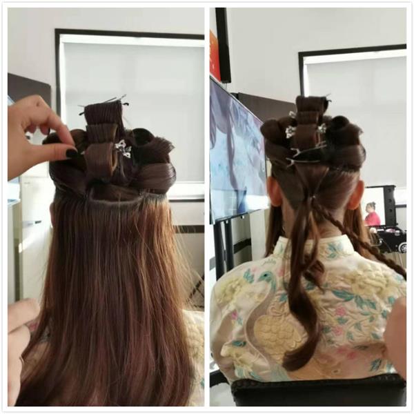 2.然后我們用卷筒的方式把后邊的頭發(fā)像堆積木的方式疊起來(lái)。由低到高一點(diǎn)一點(diǎn)慢慢變小
