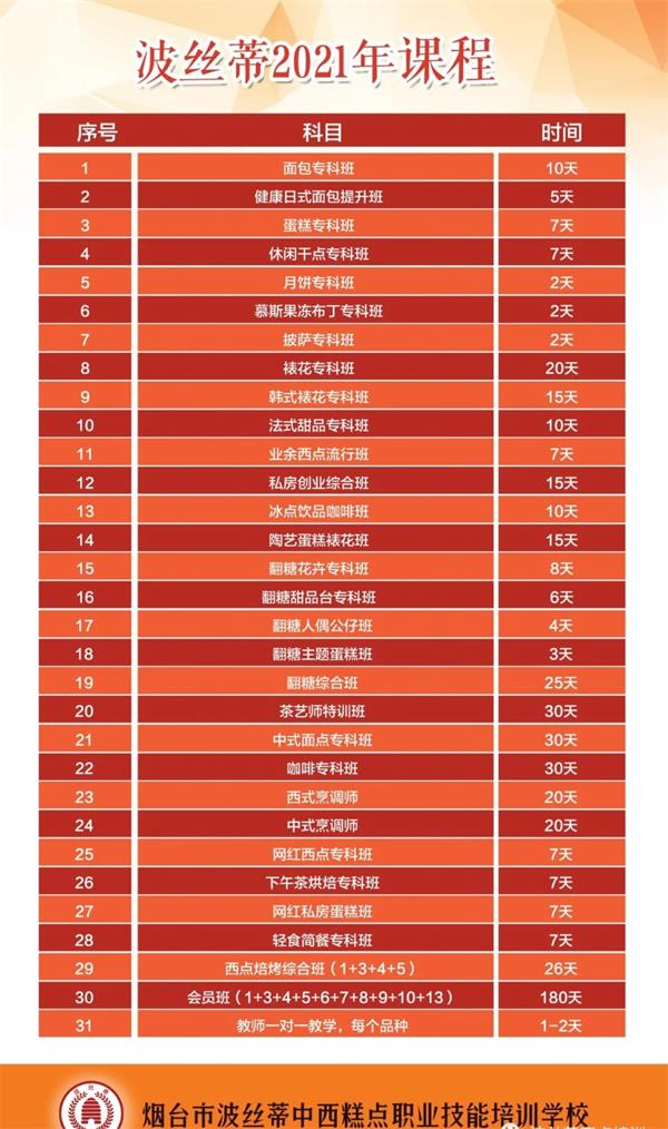 煙臺波絲蒂西點(diǎn)培訓(xùn)學(xué)校創(chuàng)立于2004年,是中西糕點(diǎn)專業(yè)培訓(xùn)機(jī)構(gòu),是煙臺市人力資源和社會保障局指定的正規(guī)技能培訓(xùn)基地;大學(xué)生及再就業(yè)人員職業(yè)技能培訓(xùn)基地;煙臺市金藍(lán)領(lǐng)高技能人才培訓(xùn)基地。西點(diǎn)課程設(shè)置全面:面包??瓢唷⒌案鈱?瓢?、休閑干點(diǎn)班、月餅??瓢唷⑴_??瓢唷Ⅰ鸦▽?瓢?、法式甜品專科班、韓式裱花班、休閑飲品咖啡班、健康日式面包提升班、私房創(chuàng)業(yè)綜合班、業(yè)余西點(diǎn)流行班等等。