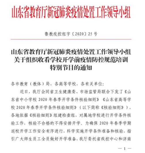 各市教育(教體)局,各高等學(xué)校,各有關(guān)單位:近日,我廳會同省衛(wèi)生健康委、市場監(jiān)管局聯(lián)合下發(fā)了《山東省中小學(xué)校 2020 年春季開學(xué)條件核驗細則》《山東省高等學(xué)校 2020 年春季開學(xué)條件核驗細則》(以下簡稱《核驗細則》),各地依據(jù)《核驗細則》組建檢查組,對屬地學(xué)校進行開學(xué)條件核驗工作,核驗不合格的不得安排開學(xué)。為確保 2020 年春季學(xué)期返校開學(xué)工作安全有序進行,科學(xué)實施開學(xué)條件準備和核驗,指引廣大師生員工全員做好開學(xué)準備,我廳委托省疾控中心和濟南市疾控中心專家,指導(dǎo)錄制了開學(xué)前疫情防控規(guī)范培訓(xùn)特別節(jié)目。請各地、各高校組織學(xué)生、教師和家長認真收看。現(xiàn)將相關(guān)安排通知如下: