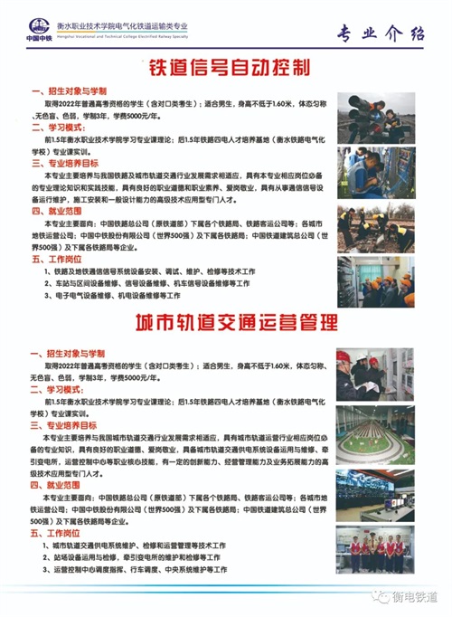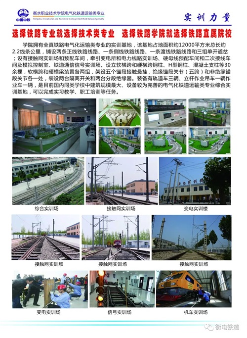 衡水職業(yè)技術(shù)學(xué)院電氣化鐵道運(yùn)輸類專業(yè)是學(xué)院與中國中鐵深入校企合作、產(chǎn)教融合共建特色專業(yè),打造鐵路和軌道交通行業(yè)“文化素質(zhì)+職業(yè)技能”的新型大學(xué)生人才培養(yǎng)模式,是全國鐵路企業(yè)舉辦的電氣化鐵道運(yùn)輸類專業(yè)的國家級重點(diǎn)職業(yè)院校,是國家電氣化鐵道運(yùn)輸類和地鐵行業(yè)后備力量的主要來源,是中國電氣化鐵道運(yùn)輸類高技能人才培養(yǎng)基地。學(xué)院下設(shè)"鐵道供電技術(shù)”、“鐵道信號自動(dòng)控制"、城市軌道交通運(yùn)營管理"、“鐵道機(jī)車運(yùn)用與維護(hù)”專業(yè),具備了全日制大專學(xué)生的培養(yǎng)資格,打造鐵路及軌道交通行業(yè)"文化素質(zhì)+職業(yè)技能"的新型大學(xué)生人才培養(yǎng)模式,突出   "應(yīng)用"  與  "技能"兩個(gè)特點(diǎn),在提高大學(xué)生文化素質(zhì)的基礎(chǔ)上,運(yùn)用學(xué)校雄厚師資和全真鐵路"四電"及運(yùn)輸專業(yè)綜合實(shí)訓(xùn)基地開展“真刀真槍"的實(shí)訓(xùn)課程.使培養(yǎng)出來的大學(xué)生不是只懂理論知識的花瓶,而是成為I正掌握實(shí)際操作技能的優(yōu)秀者。